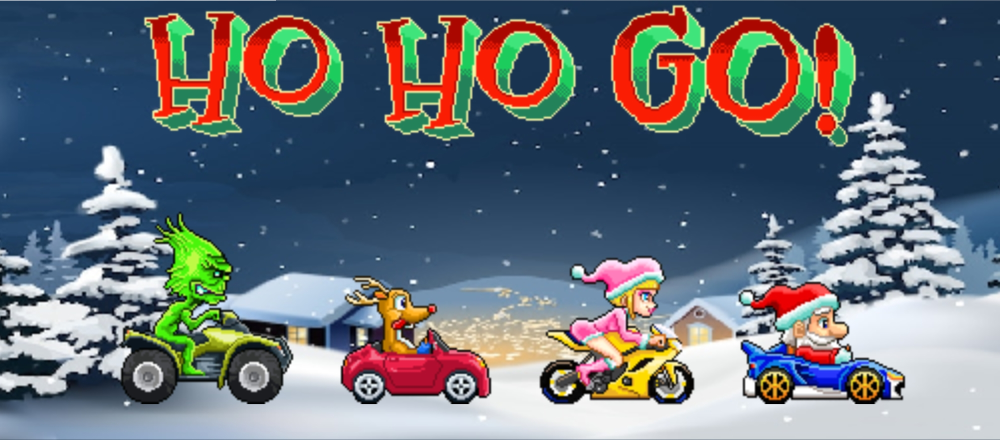 Climb into the driver's seat of Santa's car and race against Mrs. Claus, Rudolph the reindeer, and the mischievous Grinch. Pick up candy cane power-ups as you go and use them to boost your speed. See if you can be the first one to cross the finish line and win the shiny platinum cup!